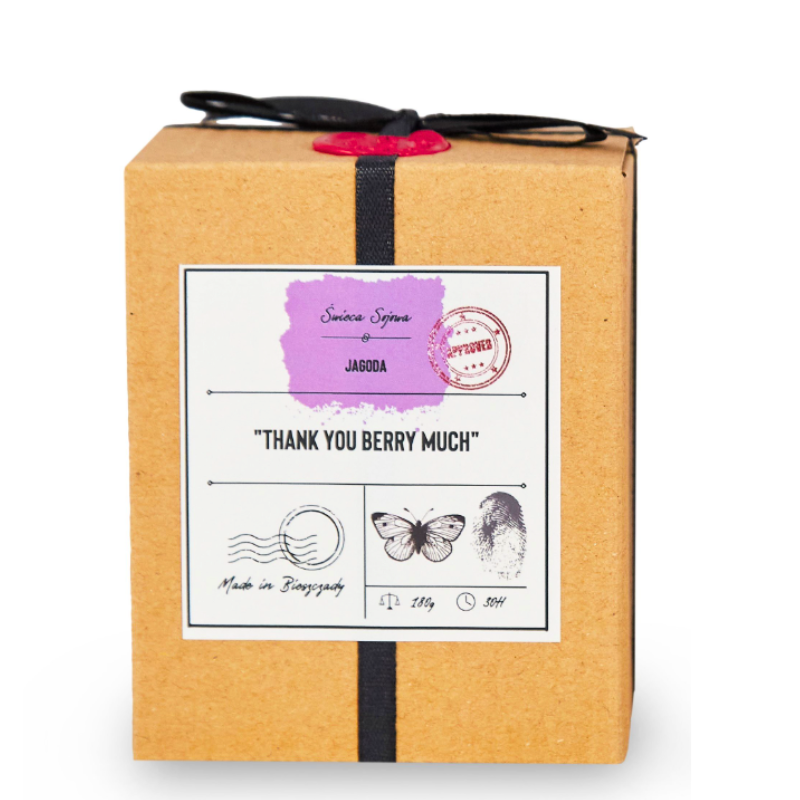 Świeca Thank You Berry Much wykonana jest w 100% z biodegradowalnego wosku sojowego. Nie zawiera parafiny, sztucznych barwników ani zbędnych dodatków. Pali się czysto i długo, a zapach uwalnia się równomiernie. Ponadto, świeca w szkle stanowi piękny element dekoracyjny, który doskonale sprawdzi się zarówno w przytulnej sypialni, jak i eleganckim salonie.