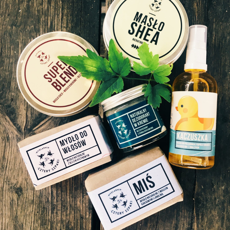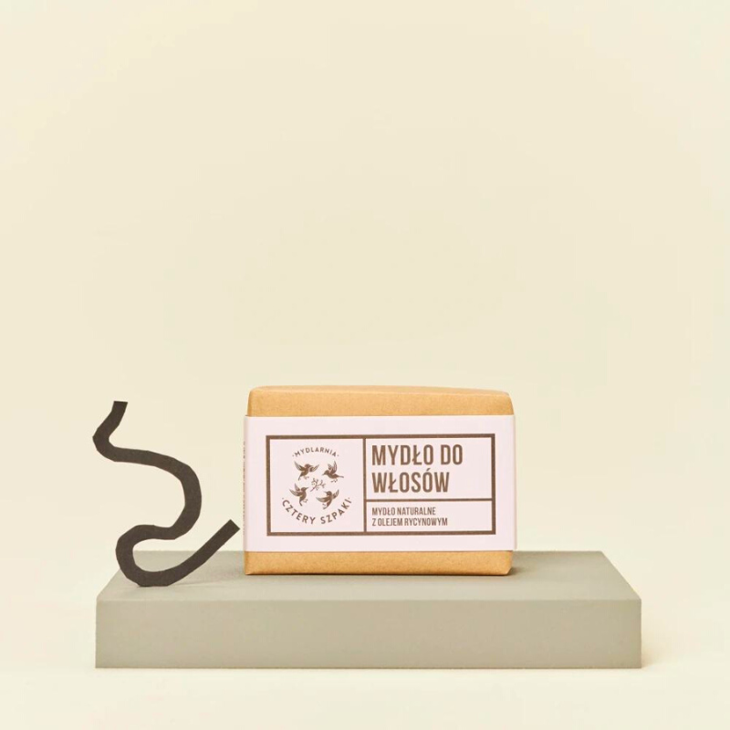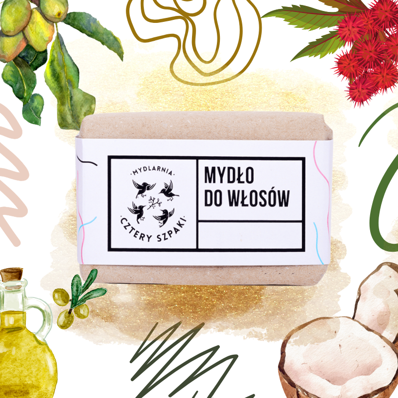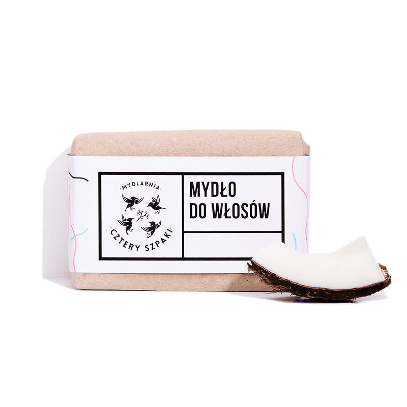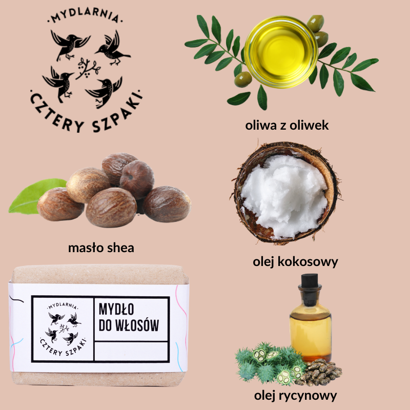 Mydło do włosów 4 Szpaki stworzono z naturalnych składników aktywnych, które nie tylko oczyszczą, ale też intensywnie będą pielęgnować Twoje włosy i skórę głowy. Bogaty w kwasy tłuszczowe olej kokosowy działa nawilżająco, nadając Twojej skórze i włosom miękkości i gładkości. Ponadto zwalcza bakterie! Olej rycynowy stymuluje wzrost włosów. Jest również korzystny dla skóry. Łatwo się wchłania, nie pozostawiając tłustego filmu, a jego właściwości przeciwzapalne łagodzą podrażnienia skóry. Masło shea, bogate w witaminy A i E, nawilża skórę, jednocześnie chroniąc ją przed szkodliwymi czynnikami zewnętrznymi, takimi jak promienie UV. Oliwa z oliwek jest cenionym źródłem antyoksydantów. Pomaga w zwalczaniu wolnych rodników, dodatkowo nawilżając i wspomagając utrzymanie elastyczności skóry. Daj swoim włosom przyjemność naturalnej pielęgnacji, sprawiając, że staną się zdrowsze, bardziej lśniące i pełne życia. Odkryj tajemnicę pięknych włosów z naszym naturalnym mydłem do włosów!