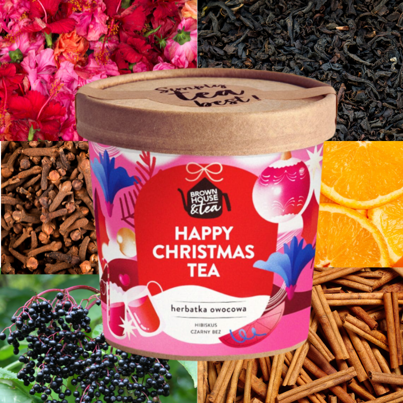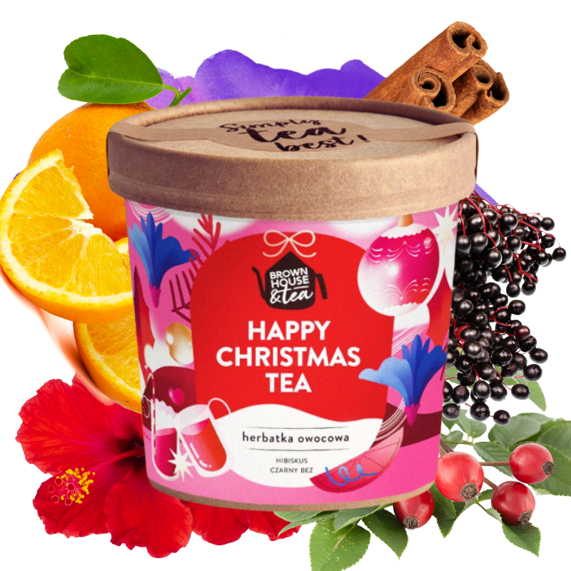 Na początku był mróz. A potem ktoś wpadł na pomysł, żeby zalać hibiskus wrzątkiem, dodać czarnego bzu, dzikiej róży i przyprawić wszystko goździkiem. Efekt? Napar, który smakuje jak wspomnienie choinki, piernika i śnieżek za oknem. Happy Christmas Tea to owocowo-ziołowa herbata stworzona na święta, ale smakuje podejrzanie dobrze również w lutym. Mieszanka powstała w rzemieślniczej pracowni Brown House & Tea – bez kofeiny, za to z pełnią naturalnych składników: kwiat hibiskusa (25%), czarny bez (17%), dzika róża, pomarańcza, cynamon, anyż, lukrecja i szczypta płatków chili. Wszystko to w formie sypanej, luźnej, gotowej na Twój ulubiony kubek.