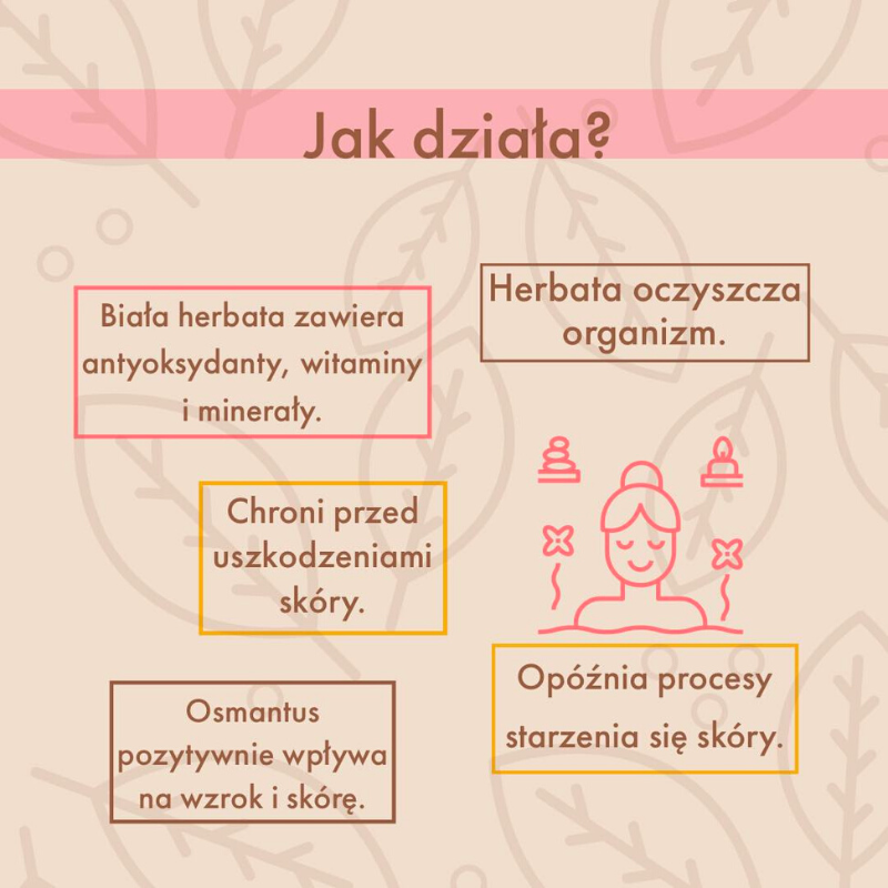 - Naturalna pielęgnacja skóry – biała herbata i osmantus wspierają elastyczność i blask.