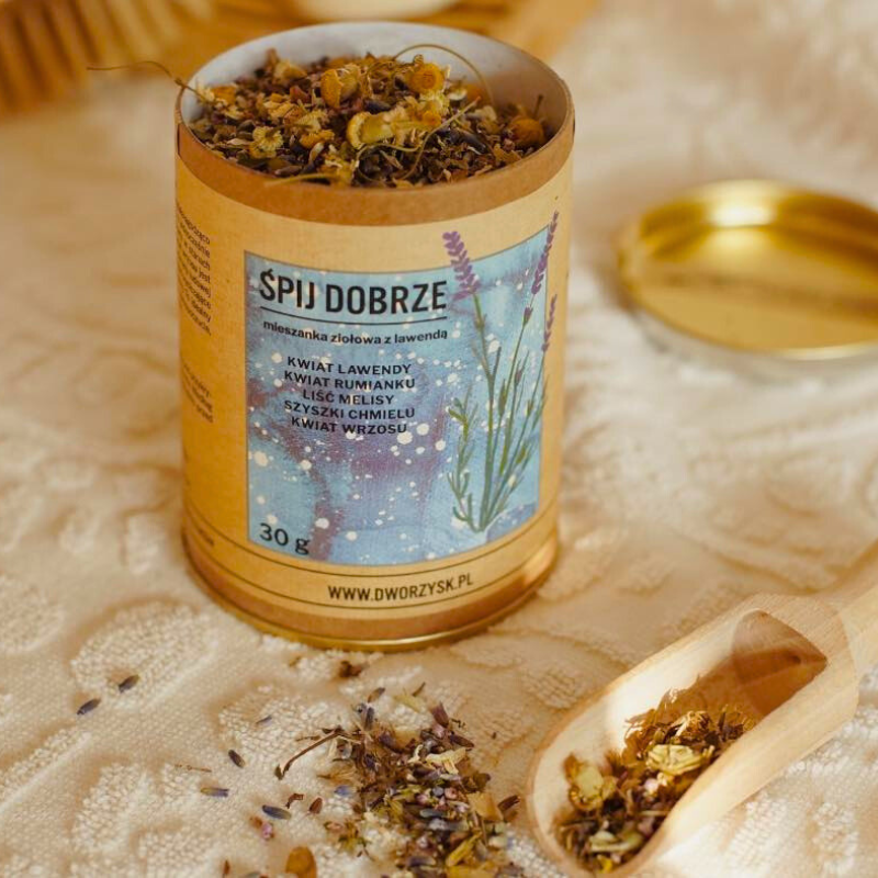 „Śpij Dobrze” to kompozycja ziołowa od Dworzysk, która jest kluczem do naturalnego relaksu i zdrowego snu. Ta starannie dobrana mieszanka to połączenie kwiatu lawendy, rumianku, liścia melisy, kwiatu wrzosu oraz szyszek chmielu. Służy do przygotowania naparu, który nie tylko koi, ale również wspiera zdrowy sen. Lawenda, ceniona za swoje właściwości uspokajające, skutecznie pomaga w walce z niepokojem. Rumianek, znany z działania łagodzącego i rozkurczowego, współgra z melisą, która uspokaja i wzmacnia organizm. Chmiel i wrzos, z kolei, regulują układ nerwowy, przynosząc ulgę w stanach nadpobudliwości. Ale „Śpij Dobrze” to nie tylko napar. Ta wszechstronna mieszanka sprawdzi się również jako składnik odprężających kąpieli oraz aromatyczny dodatek do poduszki, ułatwiający zasypianie. Wypróbuj i doświadcz różnicy w jakości swojego snu, ciesząc się głębokim wypoczynkiem i odprężeniem, jakie oferuje ta ziołowa mieszanka.