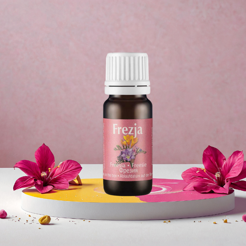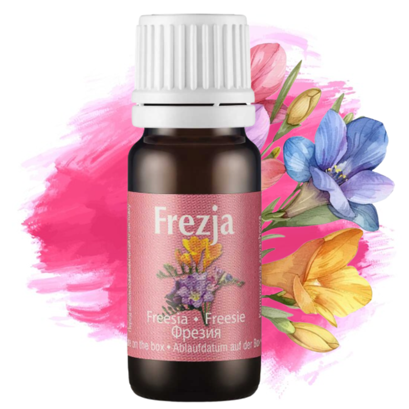 - Naturalny olejek zapachowy frezja – kwiatowy, romantyczny zapach z wyraźną nutą świeżości.