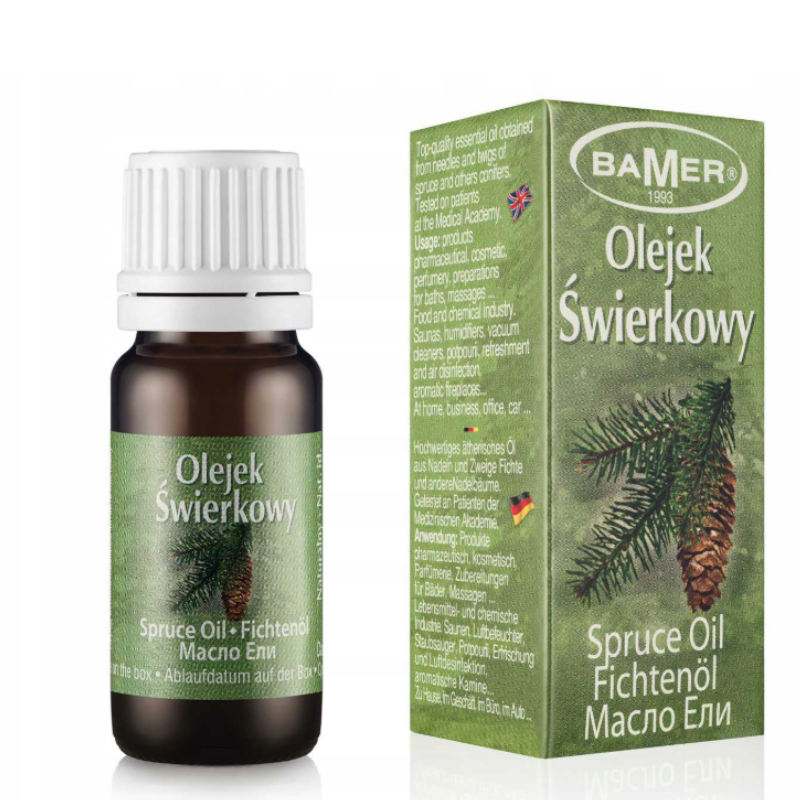 Poczuj świeżość lasu w każdej kropli! Naturalny olejek świerkowy marki Bamer to 100% czysta esencja igliwia, która wspiera odporność, oczyszcza drogi oddechowe i relaksuje ciało. Destylowany z igieł i gałązek świerku, oferuje wyjątkowy zapach oraz działanie antyseptyczne i przeciwzapalne.