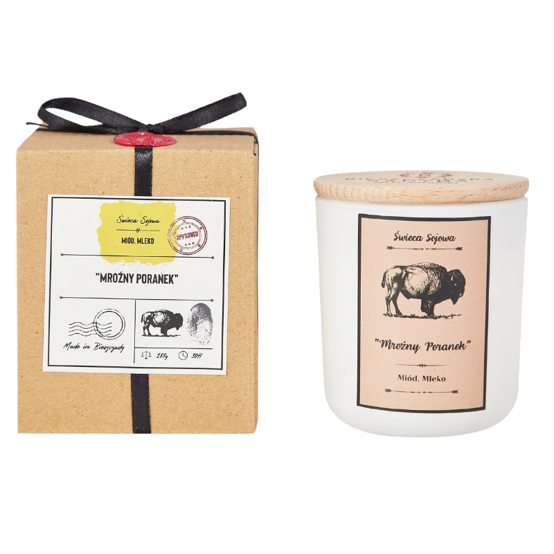 „Mroźny Poranek” od Bieszczadzkiej Sadyby to wyjątkowa, ręcznie robiona świeca sojowa, która przenosi do magicznego świata miodu i mleka. „Mroźny Poranek” łączy w sobie orzeźwiające nuty białej frezji i bergamotki, serce z miodowego bursztynu, migdała i fasoli tonka, oraz kojące akordy waniliowego kremu i drzewa sandałowego, tworząc zapach, który pobudza, otula i relaksuje. Wykonana w 100% z biodegradowalnego wosku sojowego. Bez GMO, parafiny i sztucznych dodatków. Jest bezpieczna dla alergików i idealna dla miłośników naturalnych produktów.