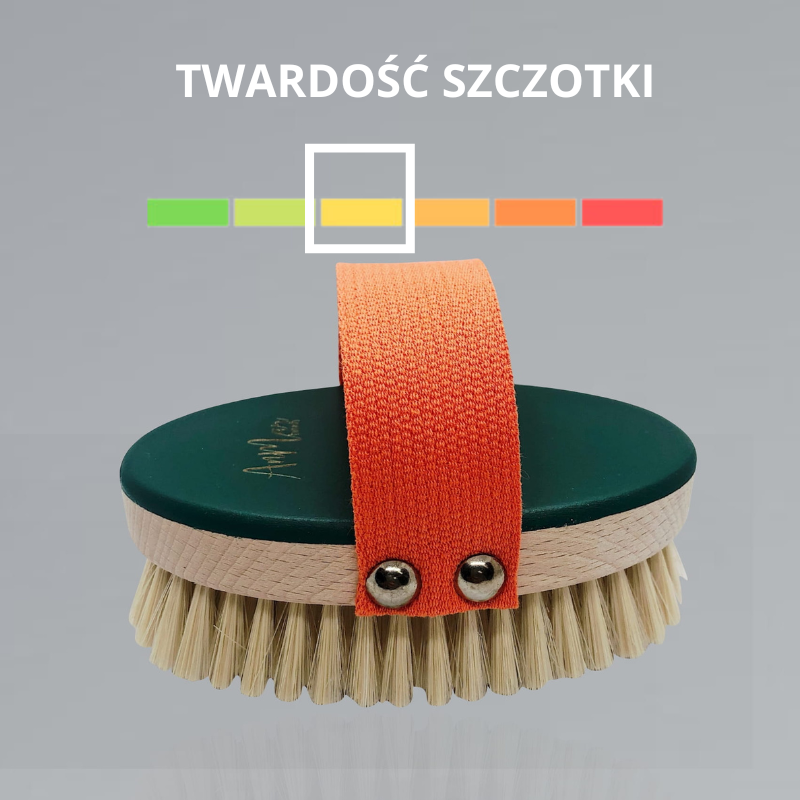 Szczotka jest biodegradowalna i w 100% polska, co gwarantuje jej wysoką jakość i zgodność z zasadami zrównoważonego rozwoju. Pomarańczowy pasek z bawełny dodaje jej uroku i ułatwia użycie podczas masażu. Wykorzystanie szczotki w domowym spa zapewnia nie tylko odprężenie i relaks, ale także staje się skutecznym narzędziem w walce z niedoskonałościami skóry.