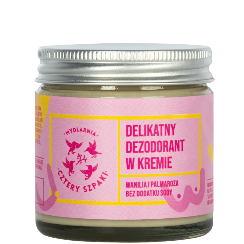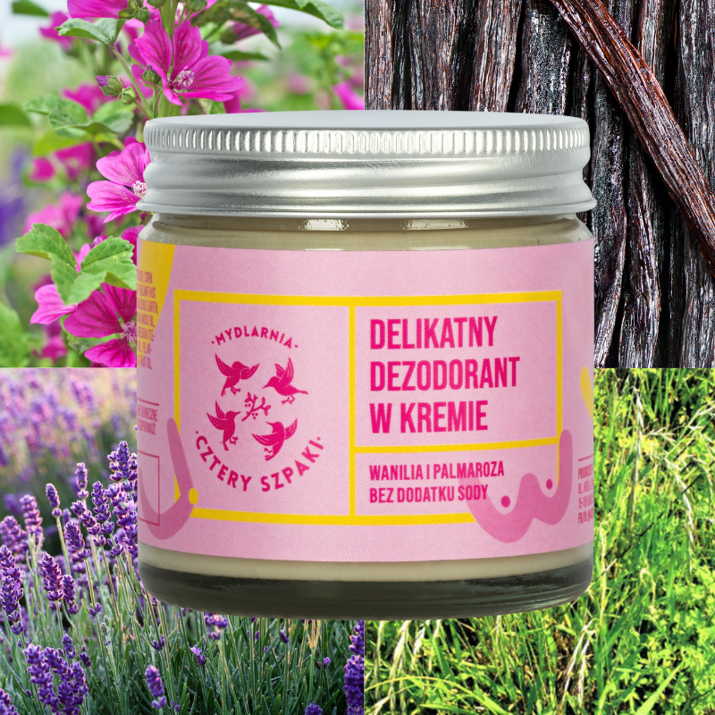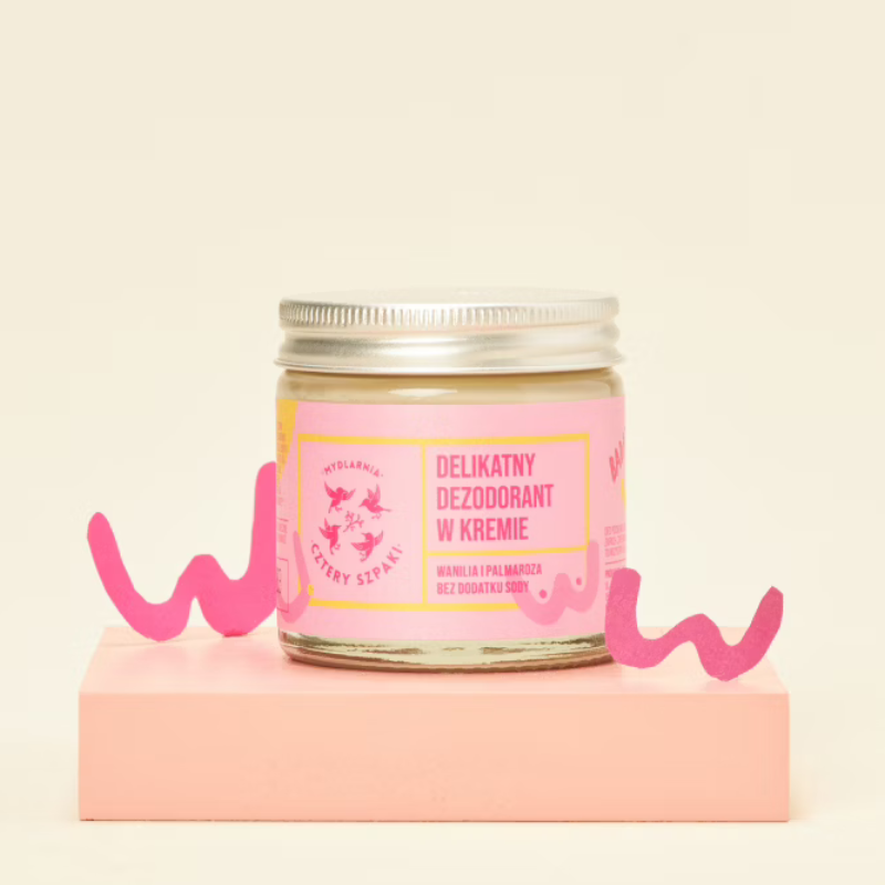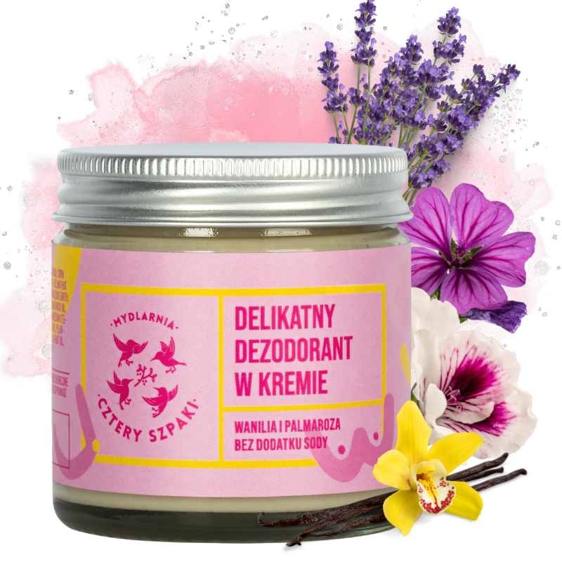 Delikatny dezodorant w kremie Wanilia i Palmaroza od Czterech Szpaków to naturalna odpowiedź na potrzeby wrażliwej skóry. Ten kosmetyk łączy w sobie skuteczność w absorpcji wilgoci i neutralizacji nieprzyjemnych zapachów z delikatną pielęgnacją. Jego wegańska formuła, pozbawiona sody, sprawia, że jest idealny nawet dla bardzo wrażliwej skóry, a także po depilacji. W składzie znajdziemy masło shea, olej kokosowy, i skrobię ziemniaczaną, które odżywiają i regenerują skórę, a także naturalne absorbenty jak glinka biała i ziemia okrzemkowa. Dodatek olejków eterycznych, w tym wanilii i palmarozy, zapewnia przyjemny, subtelny zapach. Produkt posiada certyfikat GMP, co gwarantuje najwyższą jakość i bezpieczeństwo. Słoiczek o pojemności 60 ml jest wydajny i ekologiczny, a jego zawartość wystarcza na kilka miesięcy użytkowania.
