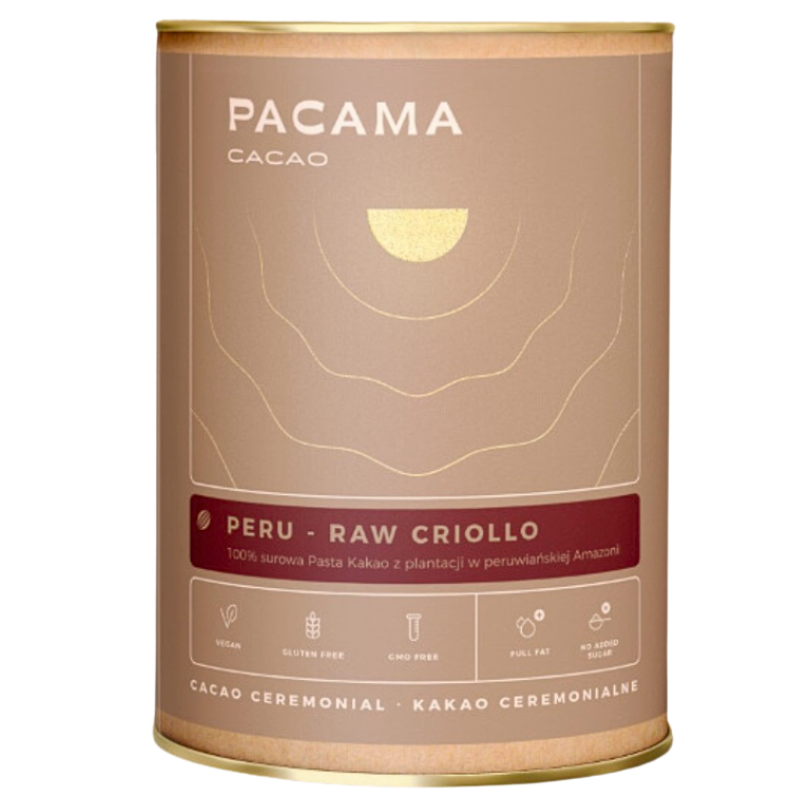 Ziarna odmiany Criollo, jednej z najrzadszych i najbardziej cenionych na świecie, dojrzewają w sercu amazońskiej dżungli w Peru. Z nich powstaje 100-procent surowa pasta kakaowa – jedyna taka w ofercie Pacama. To nie proszek ani tabliczka. To twarda, nierafinowana pasta w blokach, którą kruszysz i rozpuszczasz w ciepłej wodzie lub mleku, tworząc gęsty, intensywny napój.